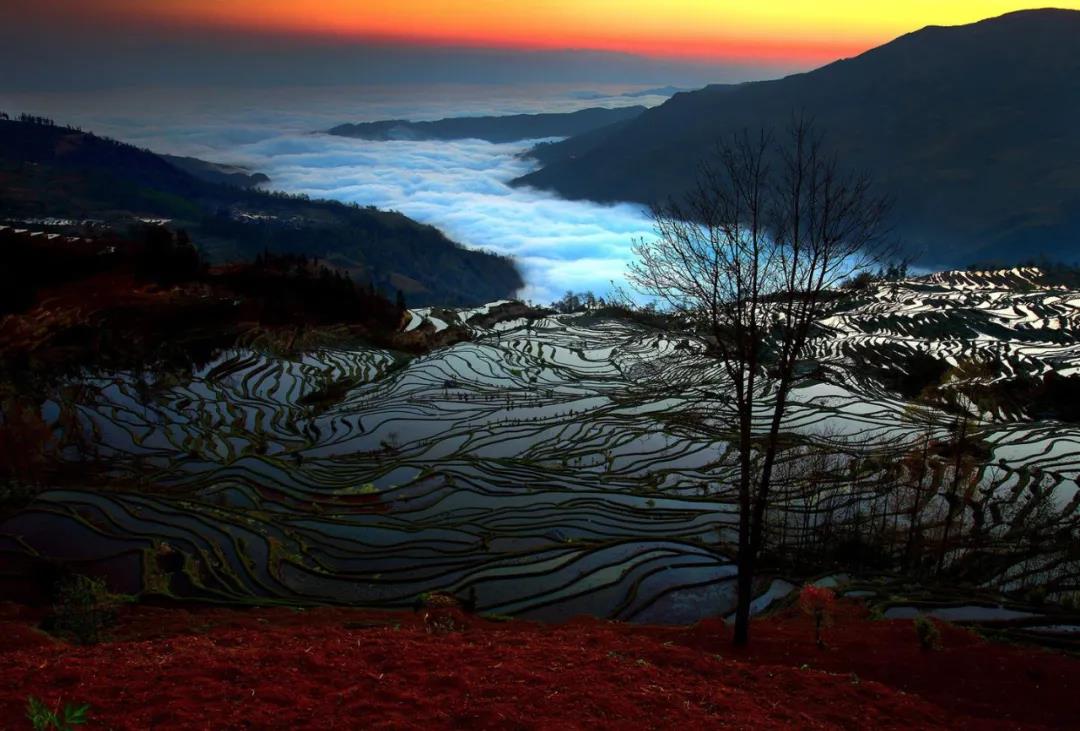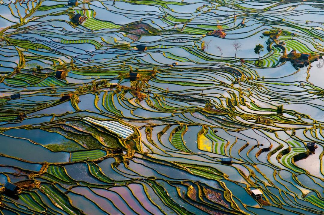 待谷物收成后,從11月中旬一直到來年春天,梯田間需要注滿水保養(yǎng)。落日時分,夕陽倒映在田間水中,流光溢彩。隨手按下快門,都是國家地理大片。
