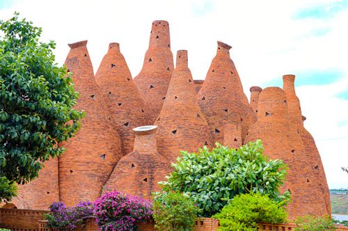 羅旭用當(dāng)?shù)厝藷频募t磚,搭建起一個個看似毫無章法的建筑,但其實建筑里糅合了三種當(dāng)?shù)匚幕?,分別為彌勒的紅酒文化,彝族的火文化及共生向上的文化。