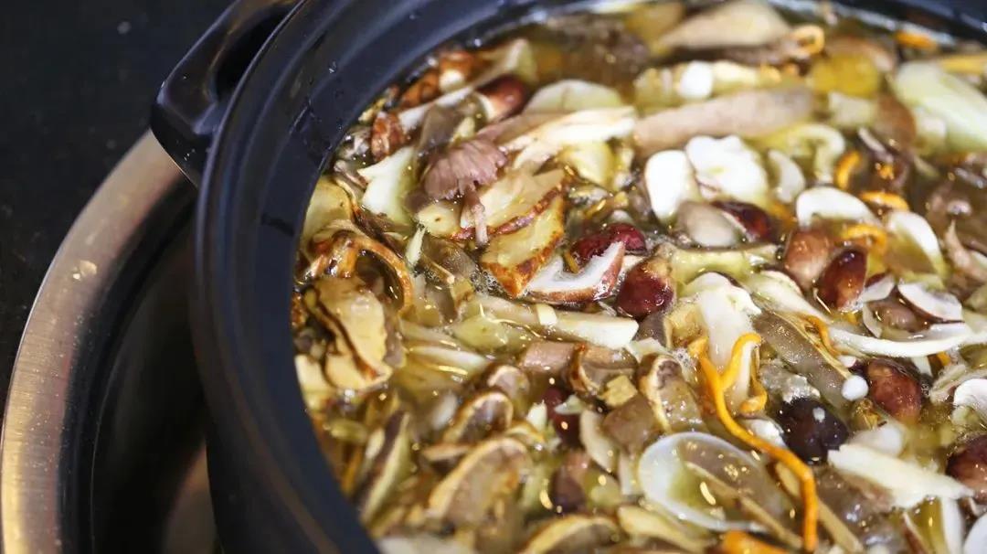 野生菌火鍋的鍋底多種多樣,一般有烏雞,放枸杞、大棗和蟲草花,也有放魚的蒸汽石鍋火鍋。這些鍋都有一個特點(diǎn),那就是看起來很養(yǎng)生!