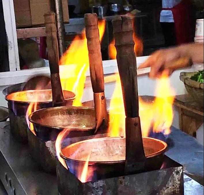 所謂小鍋,就是銅鍋一鍋一鍋的煮,煉制豬油沖湯,配上新鮮剁肉、白菜、韭菜、豆芽、油辣椒和醬油,調(diào)配比例是關(guān)鍵,辣味、咸味、酸味和諧適度地融合在一起,那叫一個香,慢慢吃,小心燙嘴哦!