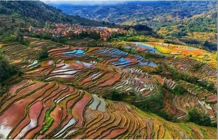 梯田在秋收后會灌滿水一直到次年插秧,這個(gè)時(shí)候看梯田層次感很強(qiáng),在陽光的照射下波光粼粼,我們在網(wǎng)上看到的很多梯田照片都是在這段時(shí)間里拍攝的。