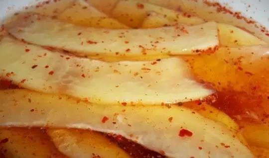 泡梨算是云南的特產(chǎn)吧,是一種獨(dú)特的泡菜。原料是麻梨,或者小葫蘆梨,做法是將梨盛于大大的陶制壇內(nèi),按比例加入甘草、酒、鹽、花椒、清水等,密封浸泡一個(gè)月左右,開(kāi)封食用。吃起來(lái)酸酸甜甜,脆脆的,還有一股甘草的清香,很特別。第一次吃的時(shí)候可能會(huì)不習(xí)慣,但多試幾次,保證讓你欲罷不能!