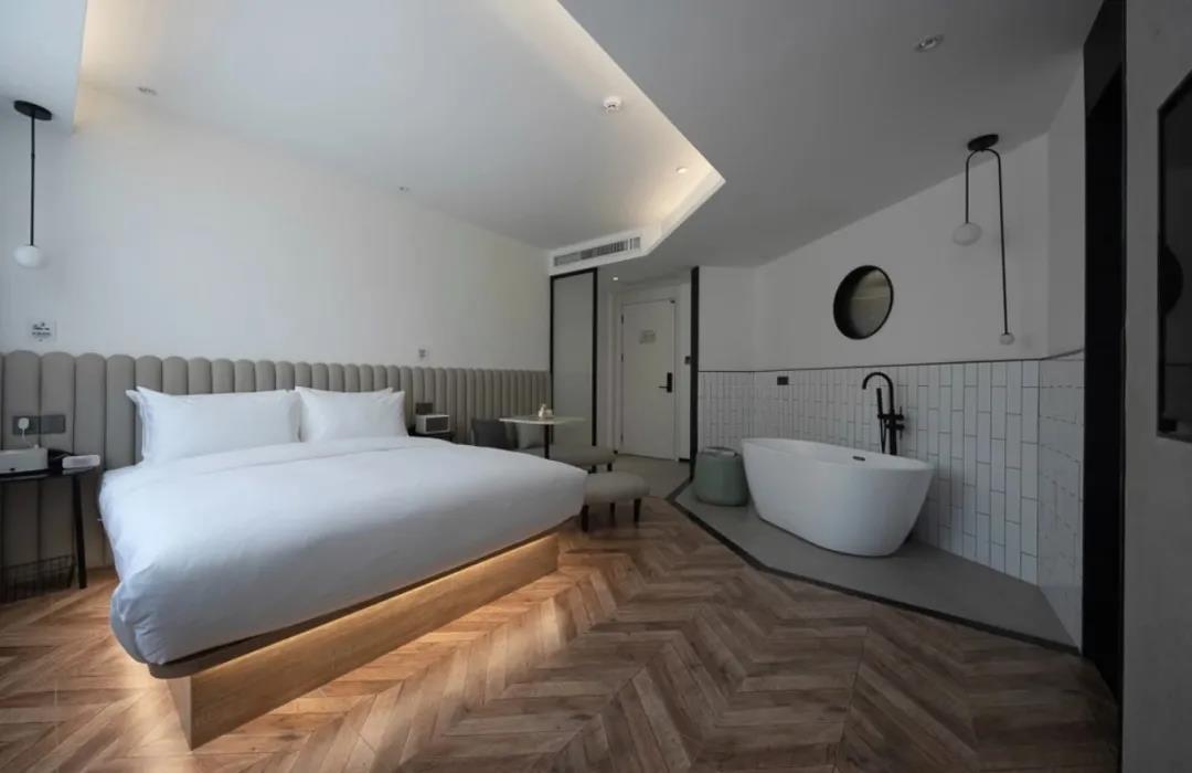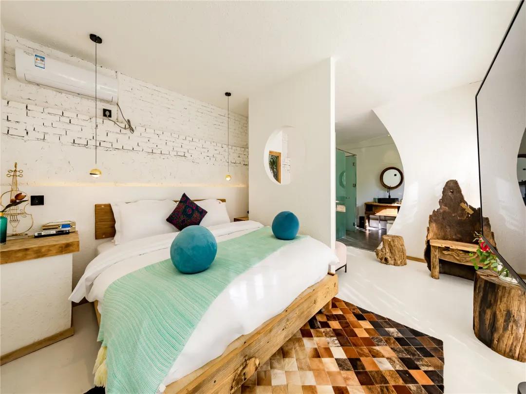 花園民宿房型分為白鳥、眠空 、天舞、藍(lán)山四種,每個臥室都配備超有藝術(shù)感的落地窗和大浴缸,隨手一拍都美美噠,房間內(nèi)做舊的桌子打造了一種年代感與時尚激烈碰撞~
