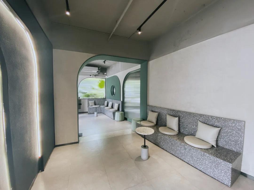 一進(jìn)門是大堂,再往里走,半圓拱門,桌椅落地窗綠植,深綠色、水磨石 灰色為主,整體安靜舒服。