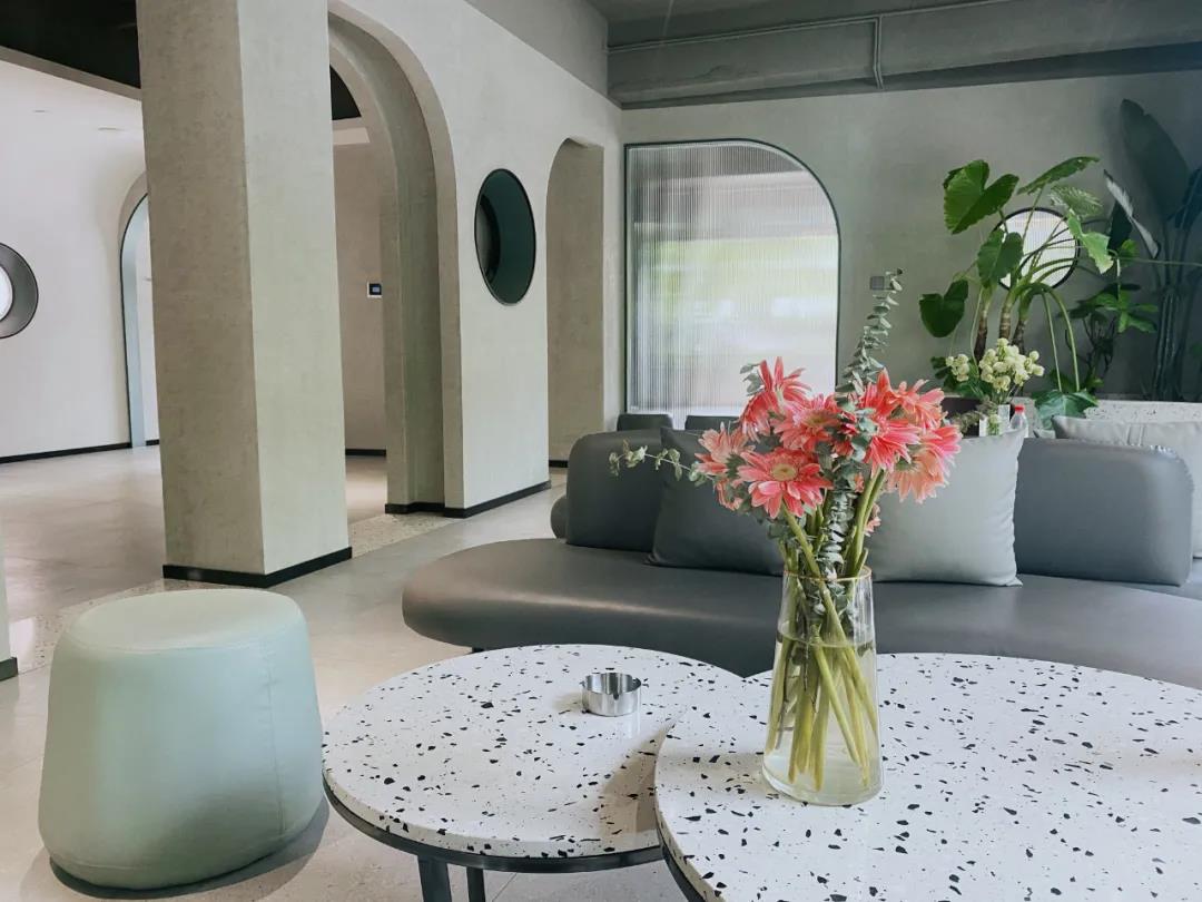 一樓整個公共開放區(qū)域每個角落都可以出片,桌上點(diǎn)綴的鮮花與周圍綠植相映成趣。