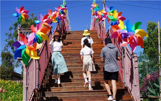 公園里,有一條彩色風(fēng)車棧道,大小不同、形狀各異、色彩絢麗的創(chuàng)意風(fēng)車,掛滿棧道兩旁的建筑。待微風(fēng)輕拂,萬余只色彩斑斕的風(fēng)車同時(shí)轉(zhuǎn)動(dòng),蔚為壯觀。