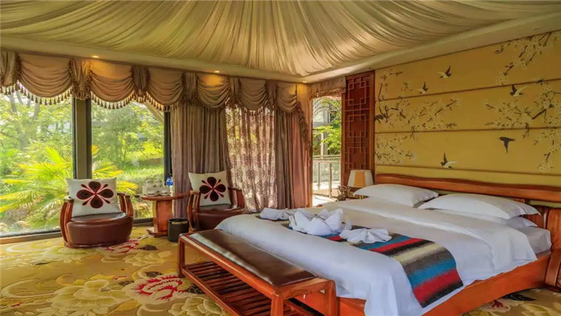 酒店共有三種特色帳篷:澳洲、彝家、軍旅帳篷。帳篷酒店依山而建、遠(yuǎn)山纏綿,就像美人的脊背。美到讓人忘記所有的煩惱,進(jìn)入徹底的避世頻道。
