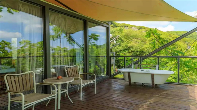 每個(gè)軍旅帳篷頂用五公分厚的橡塑保溫隔熱材料鋪設(shè),墻體由中空玻璃鑄成。且每個(gè)帳篷外均帶獨(dú)立小院,竹欄圍繞,花草簇?fù)恚瑒e有一番情調(diào)。