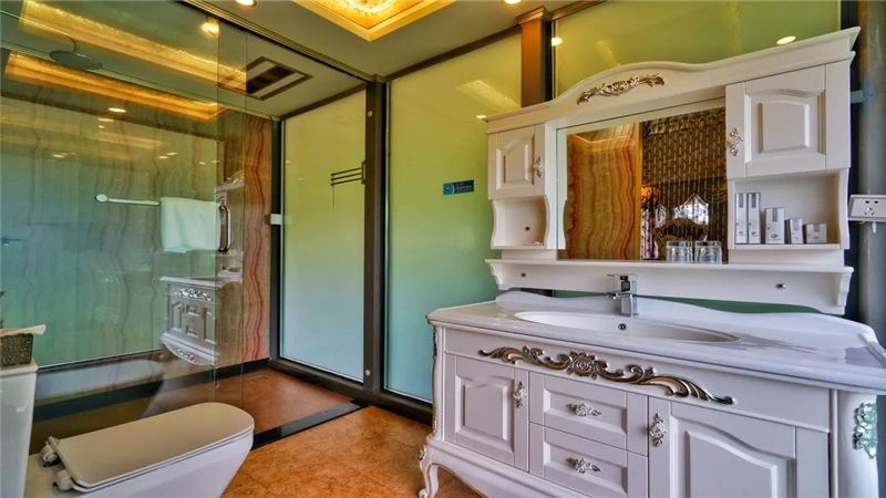 此房型設(shè)計(jì)靈感源于澳大利亞西北部沿海度假城市。作為酒店高端房型,房間配置有歐式風(fēng)格、中式風(fēng)格和新中式風(fēng)格。房間棧道采用透明玻璃護(hù)欄,四周綠蔭蔽日;房間所在地勢高峻,頗有“不畏浮云遮望眼,只緣身在最高層”之感。