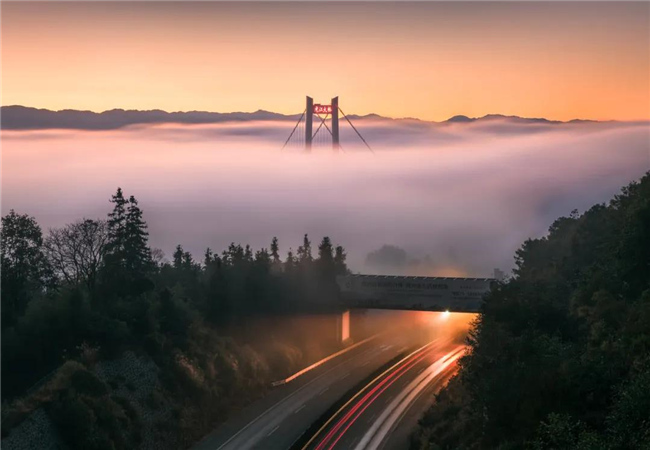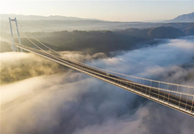 站在觀景臺上向上望,大橋在云霧中伸向前方,又消失在前方對岸的霧海中,像是一條在云霧中飛騰的神龍,見首不見尾,是自駕時(shí)不可錯(cuò)過的震撼打卡地。