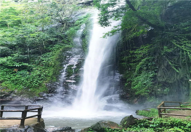 在峽谷盡頭,一幅從60多米高的絕壁上似狂瀾而傾瀉的瀑布吊掛空中,看著銀河白練的壯觀景象,呼吸著負(fù)離子與水汽參雜的濕潤空氣,是在鋼筋水泥里生活的人們最奢侈的體驗(yàn)。