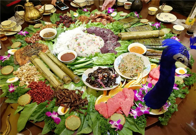 少數(shù)民族菜品的酸,甜,辣,鮮多重味覺都融入這桌豐盛的菜肴里,令人食欲大開。