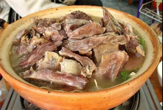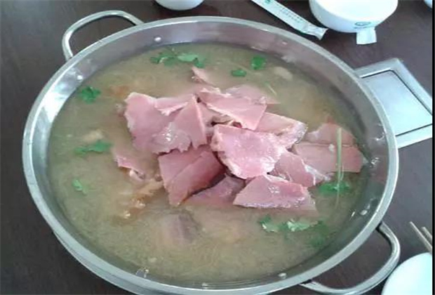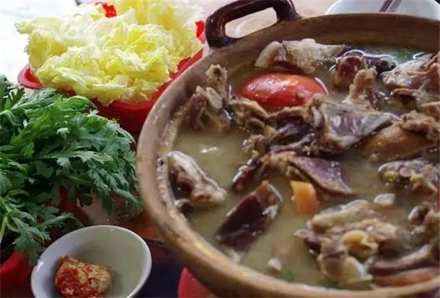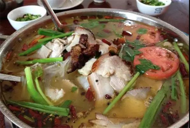 臘排骨火鍋選用的是經(jīng)土法腌制的排骨,用砂鍋燉煮,食用時通常配備時鮮蔬菜:薄荷、韭菜根、西紅柿、芹菜、洋芋、野生菌、茨菇、板藍根、粉條等等。以當(dāng)?shù)靥赜械恼核{(diào)味,鮮美濃郁,肉香汁鮮,卻愈煮愈香。再佐以當(dāng)?shù)孛拙?,其滋味妙不可言?