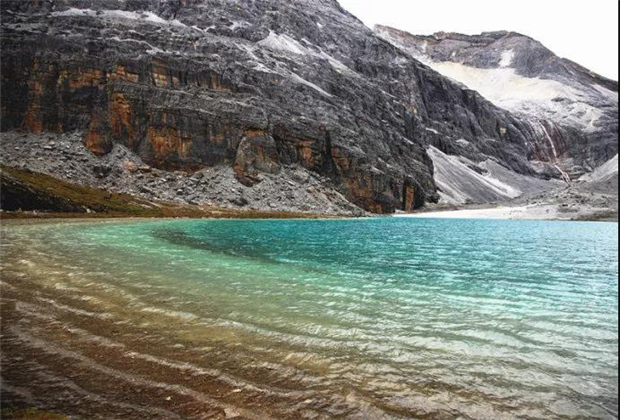 四周雪山環(huán)繞,湖水清瑩碧藍(lán),湖畔則是一圈乳白色環(huán)繞,故稱牛奶海。