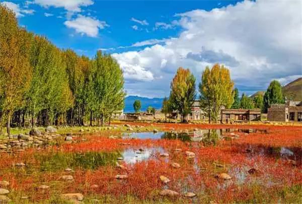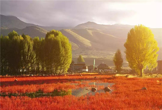 村邊有一個(gè)足球場(chǎng)大小的濕地,每年的9月底10月初,一團(tuán)團(tuán)一簇簇水草象被點(diǎn)燃了一樣,紅的像火,吸引了川藏線上無數(shù)的行人駐足。