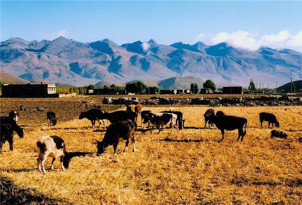 貢嘎河從牛場(chǎng)穿過,成群的牛羊在河邊和山坡上悠閑的吃草,一派和諧景象。