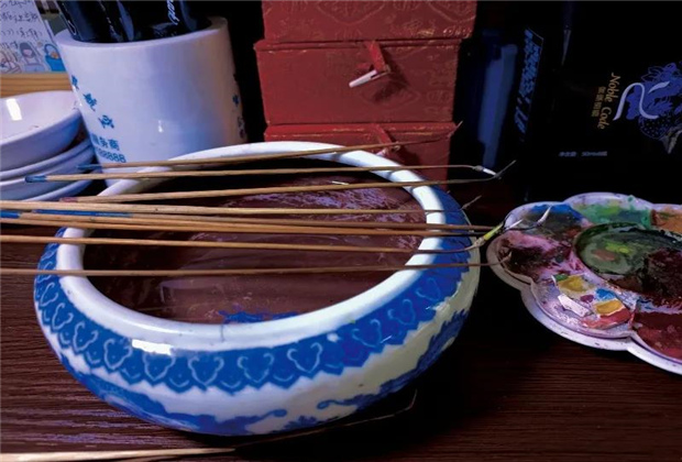 “要學(xué)內(nèi)畫,先得學(xué)做筆”這是孫鴻雁經(jīng)常對她的學(xué)生說的一句話。據(jù)了解,這個畫筆在傳統(tǒng)內(nèi)畫基礎(chǔ)上改革創(chuàng)新了幾次。傳統(tǒng)筆桿用的是鐵絲,而滇派內(nèi)畫選用的是金竹。新鮮的竹子曬一年半左右,可以保持一定水分又不會太干,彎曲后可以回到原處,如此作出的畫筆,無論從細度、弧度,還是韌性上,都更適合于在狹小的瓶內(nèi)空間創(chuàng)作,穿梭在狹窄的瓶口,游刃有余。