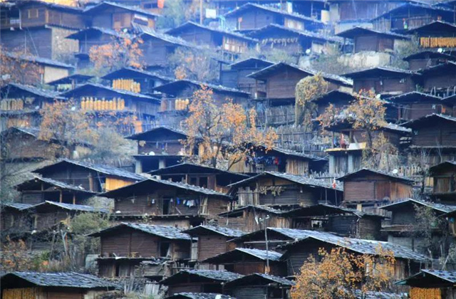 在村里,房屋基本都是木質(zhì)結(jié)構(gòu)的,木質(zhì)的屋頂上壓著用以固定的石頭,井干式的木楞房依山而建,錯落有致。