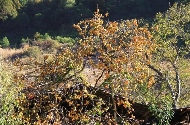 沿著干凈的石板小巷向前,兩邊的柵欄里種著幾棵柿子樹,樹干被歲月剝蝕,樹葉都已落光,但掛在枝頭的柿子依舊是鮮艷的橙色,還散發(fā)著一股清