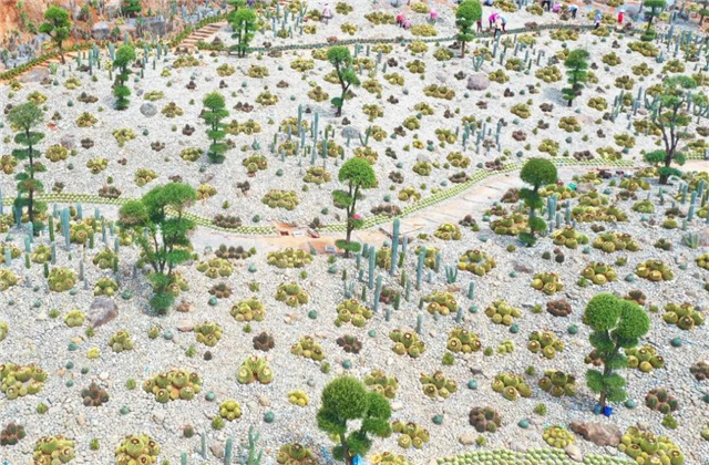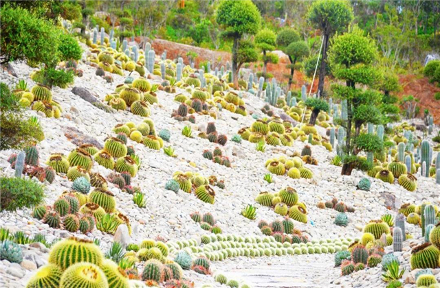 小鎮(zhèn)里還有個(gè)山地石漠化公園,偏坡山地上鋪滿鵝卵石,鵝卵石縫隙間種上仙人掌、龍舌蘭等沙生植物和景觀樹,形成了令人驚嘆的奇特景觀。