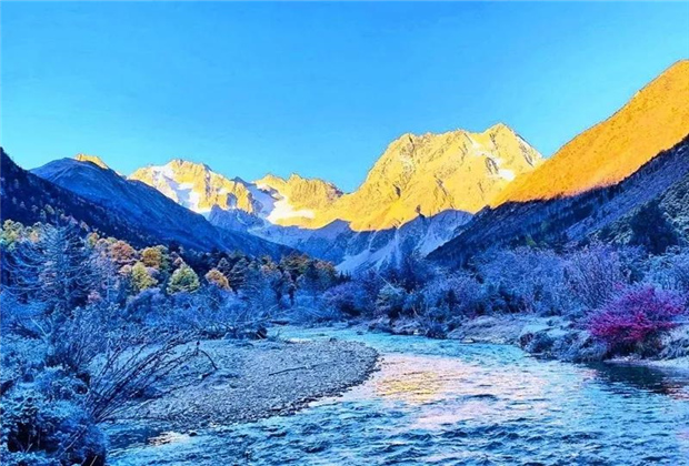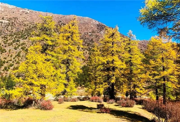 白馬雪山自然保護(hù)區(qū)屬于寒溫性森林生態(tài)系統(tǒng)類型,有中國低緯度高海拔保存比較完整而原始的高山針葉林區(qū)。深秋,這些高山針葉林都染成了金黃色,在高原陽光和雪山的襯托下,更加色彩繽紛、秋色絢麗。原始森林層林盡染,將白馬雪山的色彩裝飾成如同油畫般濃郁。