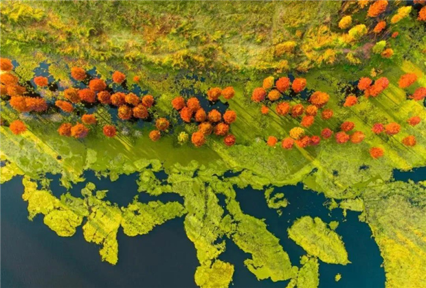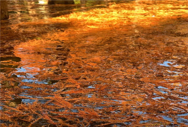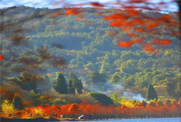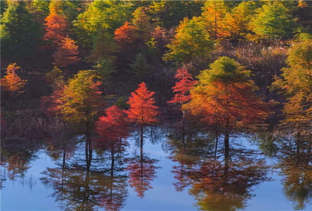 錯(cuò)落有致的水杉倒映湖中,或紅、或黃、或紅中帶黃,絢麗多彩猶如一幅濃墨重彩的油畫(huà)。