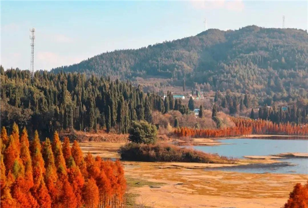 水庫(kù)四周種植了一排排整齊的水杉,隨著季節(jié)的變換不斷更換著它的顏色。