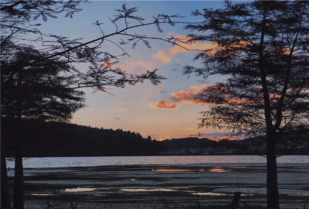 日落時(shí)分,踩在落葉上的沙沙聲,偶爾飛過(guò)的白鷺,樹(shù)林的陰影慢慢疊加,顯得清冷而又平靜。