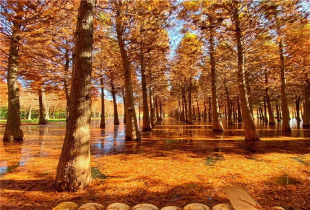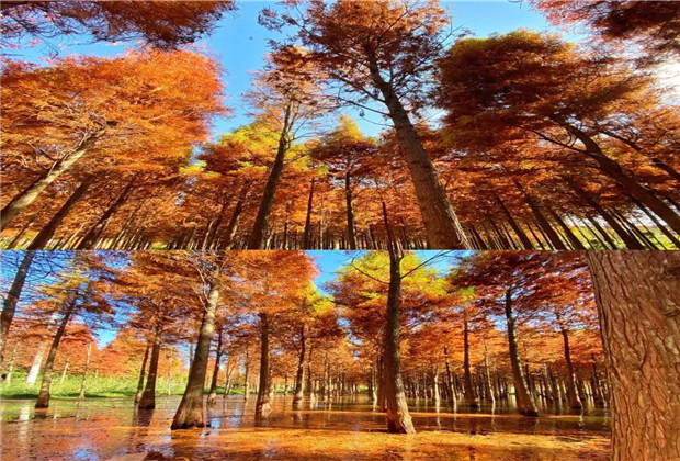 蜿蜒曲折勾勒出水邊線(xiàn)條的排排水杉、倒影在藍(lán)色的水面,因?yàn)榍锷境傻幕鸺t樹(shù)葉、筆直挺拔的樹(shù)型,融合在如鏡的水面,宛若仙境的畫(huà)面,好看極了。