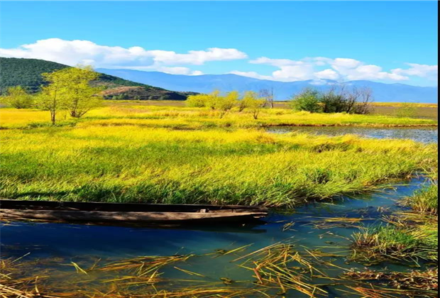 草海內(nèi)蘆葦如墻,水路錯綜,有時會有紅白衣裙的摩梭姑娘劃著豬槽船出沒其中,悠揚的“啊哈吧啦”民歌在水草叢中回蕩,別有一番情趣。