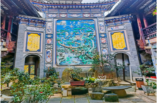 三坊一照壁,典型的大理白族民居,代表大理處于六詔中央,泥塑,彩畫、木雕栩栩如生,是大理壩子里面最著名的三坊一照壁經(jīng)典建筑之一。三坊圍合,用大理石云紋的廊頂,把三坊庭院裝點(diǎn)得如畫。景德鎮(zhèn)瓷板的鑲嵌,東陽木雕的細(xì)膩、劍川木雕的粗曠,似乎讓你走進(jìn)金碧輝煌的世界。