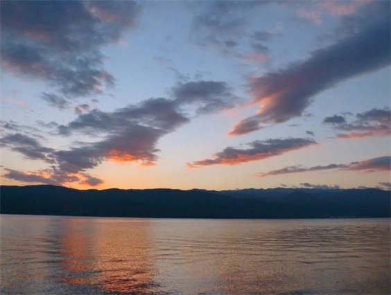 這里是云南永勝美麗的程海湖,清晨,東方漸白。山野和村莊漸漸清晰,云層慢慢亮開,由白色一點(diǎn)點(diǎn)暈染成橘色。