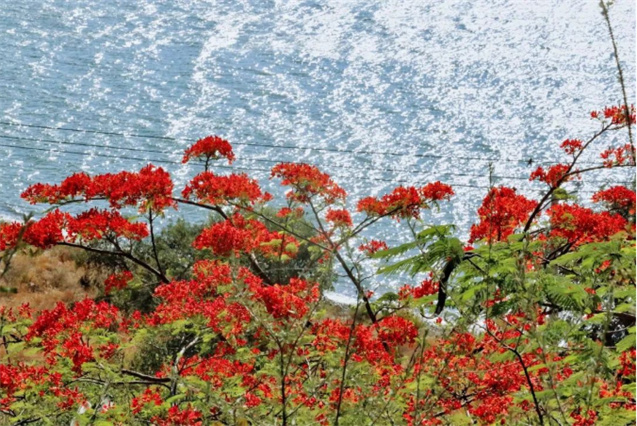 程海,似乎是最近幾年才慢慢被人熟悉。如果一定要有個(gè)根源,我想,那便是西岸火紅的鳳凰花,一到五月就亮麗了盛夏,也熱紅了外來游人的眼。
