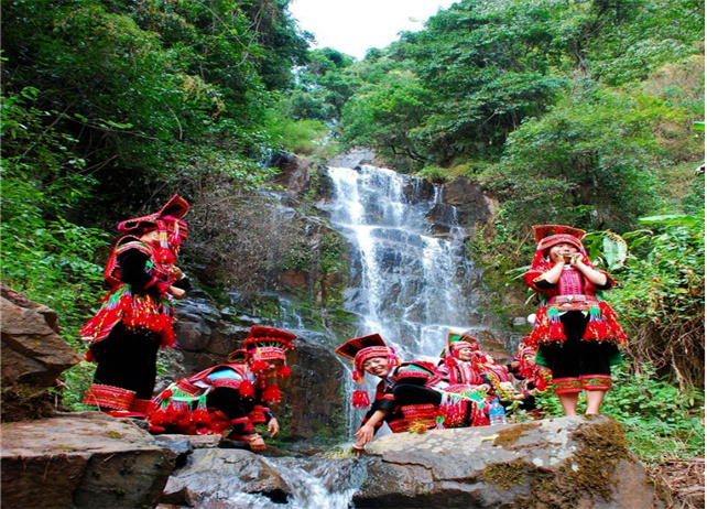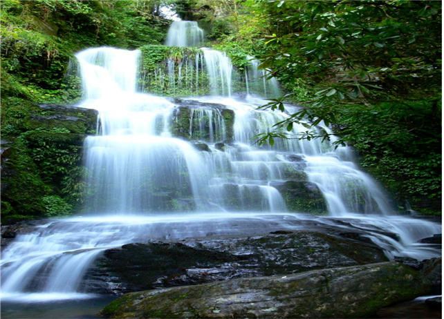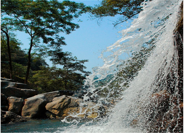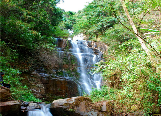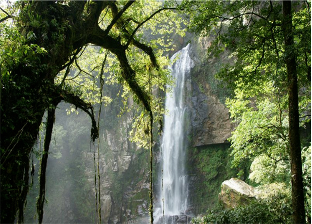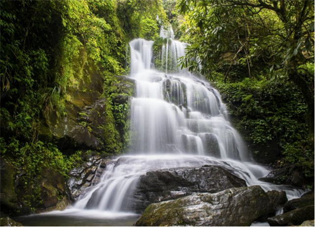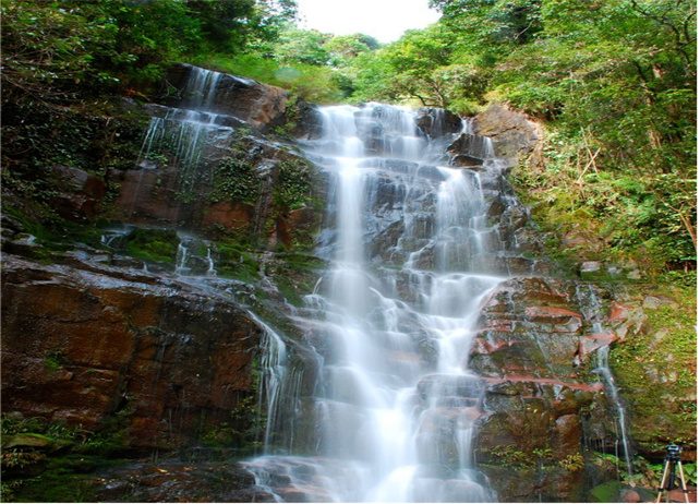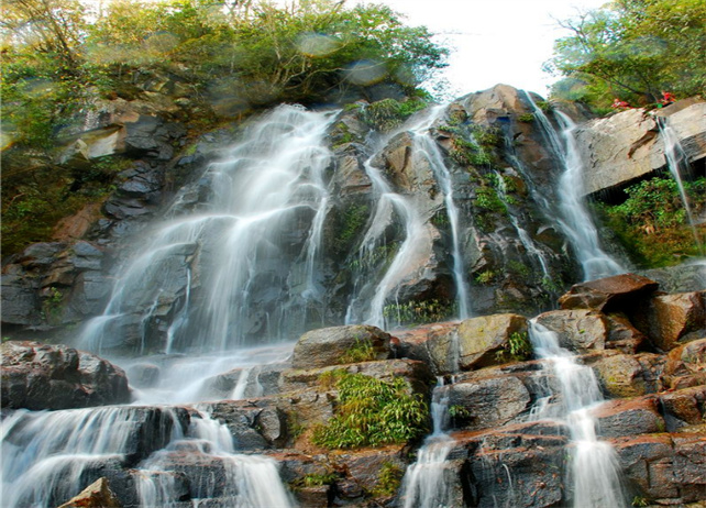 九層瀑布由大圍山原始森林公園內(nèi)眾多的溪流、山泉匯合而成,瀑布共有三疊,每疊三層,共九層,順石隙飛流直下,絕美壯觀。