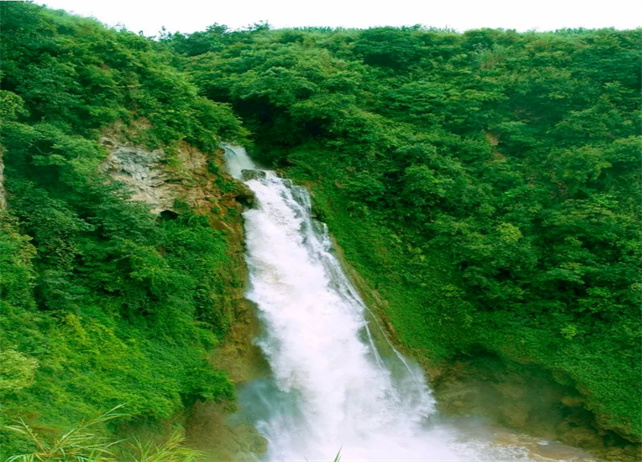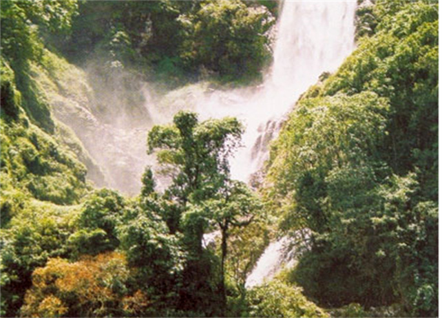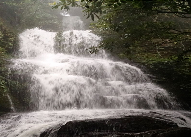 滴水層瀑布從兩山夾縫中的密林里以排山倒海之勢飛瀉而下,墜入天生似盆的滌潭中。潭里濺起的水花像一朵朵水晶做的白梅,高高拋起又紛紛飄落,整個谷底煙霧騰騰。走近瀑布,那嘩嘩的流水聲從谷底傳來,排山倒海,似萬馬嘶鳴。