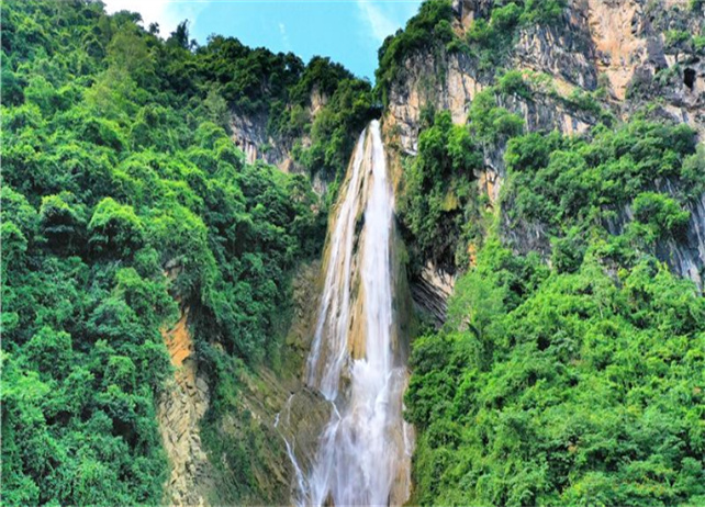 金平滮水巖瀑布被喻為一簾垂掛在藍天上的“白色哈達”。雖不及“飛流直下三千尺,疑是銀河落九天”的夸張,但它的壯美,令人心馳神往!滮水巖瀑布自上而下全長256米,傾角75度,上簾寬3米,下簾寬35米,豐水期下簾寬可達40多米。