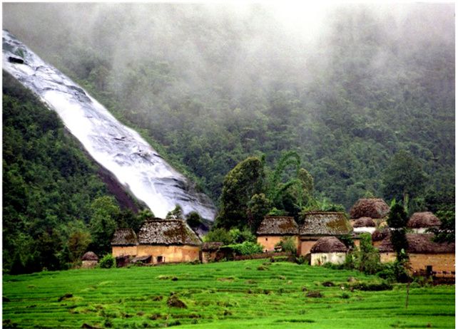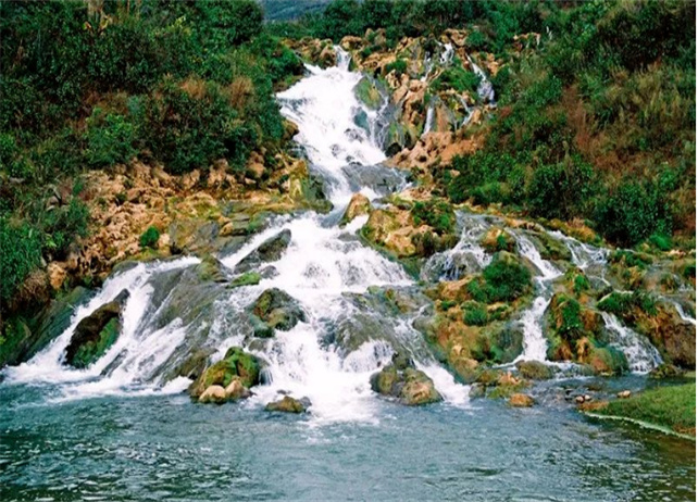 由屏邊縣城出發(fā),沿牧羊河而下,向西北行至7千米處的滴水層,站在326國道上便可見一條懸掛在幾十丈高的絕壁峭巖上的瀑布,這就是滴水層瀑布。