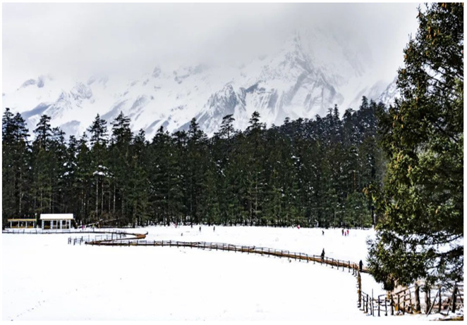 而在雪山之下,孕有森林、草甸、湖水,皚皚白雪與山野綠色輕松實現(xiàn)同框。