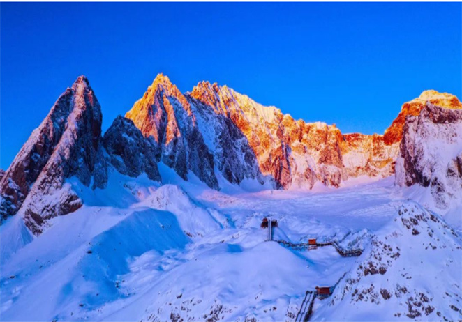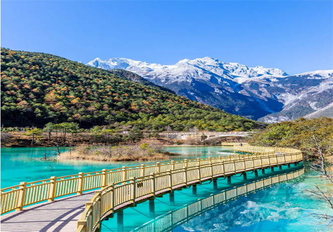 列車線路全長20.465km,南起麗江游客中心站,北至玉龍雪山站,共途經(jīng)5座車站,串聯(lián)起玉龍雪山、白沙古鎮(zhèn)、玉水寨、東巴谷和甘海子等主要旅游景區(qū)。