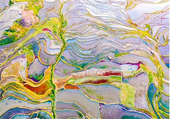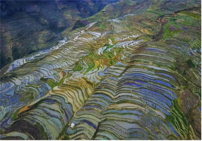 一道道田埂像一座座獨(dú)木橋,只有一雙腳并排的寬度,因此只能在同個(gè)方向獨(dú)行前進(jìn),或者選擇原路返回,沒(méi)法兩個(gè)人同時(shí)前進(jìn)。沒(méi)走過(guò)田埂的人,很容易走著走著就掉到田里去。而往往就有那么一些人,喜歡挑戰(zhàn),即便腳下再不穩(wěn),也要搖搖晃晃走完整個(gè)田埂。走田埂確實(shí)是近距離接觸梯田的不二選擇,在春天這個(gè)浪漫的季節(jié)里,怎能錯(cuò)過(guò)梯田美景呢?