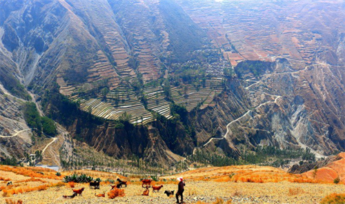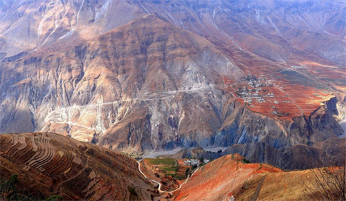 在巍峨的崇山峻嶺間,蜿蜒蛇行的山間小道就象是一條條白色的綢帶彎彎扭扭地系著大山和農(nóng)舍,綠油油的田園,規(guī)劃有序的房屋村寨,村民家里裊裊升起的炊煙,與四周險峻、貧瘠荒涼的峽谷形成了鮮明的地貌反差。生生于此,祖輩布多人都肩負著尋找生命的活泉,除了把汗水滲進紅壤,他們從大海草山的高山水域將流泉引到布多,在東山上開挖溝渠,灌溉田地。布多的綠意險些被紅色的群山圍困,刀劈斧削的絕壁似乎飛鳥難近。這是一種融進血液的驚心動魄的悲壯的美。這種美會情不自禁地激發(fā)人骨子里的向善元素,產(chǎn)生悲天憫人的情懷。