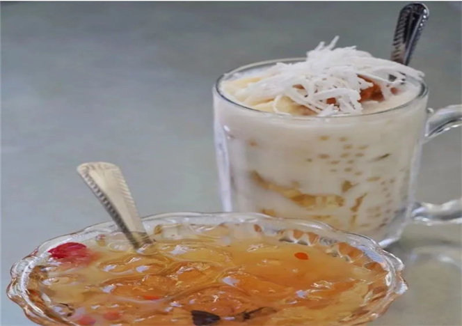 冰稀飯以白糯米為主料,配以小紅棗、西米、芝麻、紅綠絲、紅糖稀、冰渣,突出糯米稀飯的香糯,色澤潔白,點綴色澤鮮艷的果品,紅糖稀的純甜,冰渣的涼爽,一碗下肚,舒服至極。