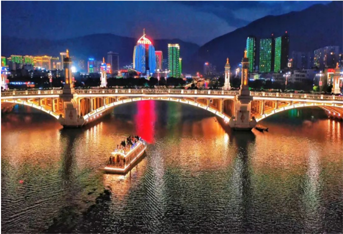 一路總覽大理市的夜色與繁華。航線還經(jīng)過大理的網(wǎng)紅橋“興盛大橋”,在各色霓虹燈映襯下,游船穿過這座英倫風(fēng)十足的大橋,仿佛穿越時(shí)空行駛在泰晤士河之上,別有一番意趣。