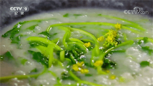 再加入鮮嫩的小油菜 不停攪拌烹煮 放上油菜花點(diǎn)綴 像極了凝固的春景圖畫