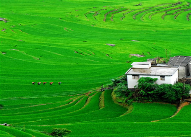 到了夏天層層疊疊的梯田被翠綠掩蓋起來蒼翠欲滴是最好的描述行走在田埂上頭頂?shù)奶炜罩酗h著朵朵白云腳下的田野里全是翠綠身心也不由得舒坦起來。