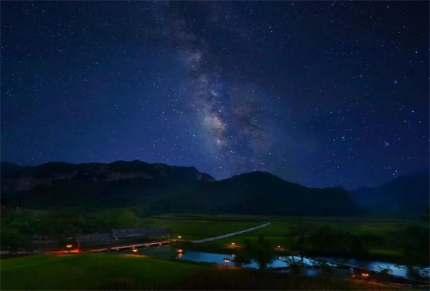 秋收的喜悅聚集著喧鬧的人流,金黃的稻浪翻涌。柔風(fēng)拂面傾瀉在低垂的稻穗上,搖曳的穗浪撩開一片動人的漣漪,彌漫出世外古樸的稻香。當(dāng)目光迷離的時候,夢境也徜徉起來。滿天星空倒映在河流與岸之間,一抬頭,天邊劃過的流星仿佛穿越千年的時光,那個被悠悠歲月洗濯了千年的桃源夢,清晰而玲瓏地舒展在壩美的秀水明山中。