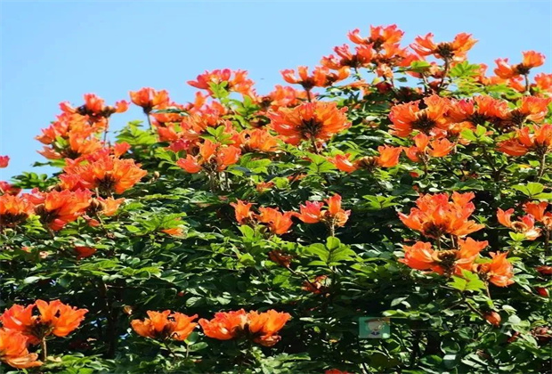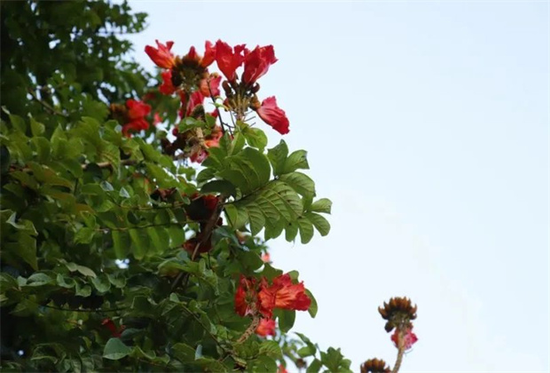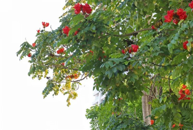 火焰樹(shù)屬喬木,樹(shù)干高大、樹(shù)冠茂盛,常被作為行道樹(shù)和蔭庇樹(shù)?;鹧鏄?shù)有著火焰花、火焰木的別稱,花期主要在冬春季之間,因綻放的花朵形如火炬,深紅色的花瓣邊緣有一圈金黃色的花紋,異常絢麗。遠(yuǎn)遠(yuǎn)望去,生長(zhǎng)在枝頭的火焰花如一只點(diǎn)燃的火炬一般,因此火焰花也被人們形象地稱之為“冬天里的一把火”。