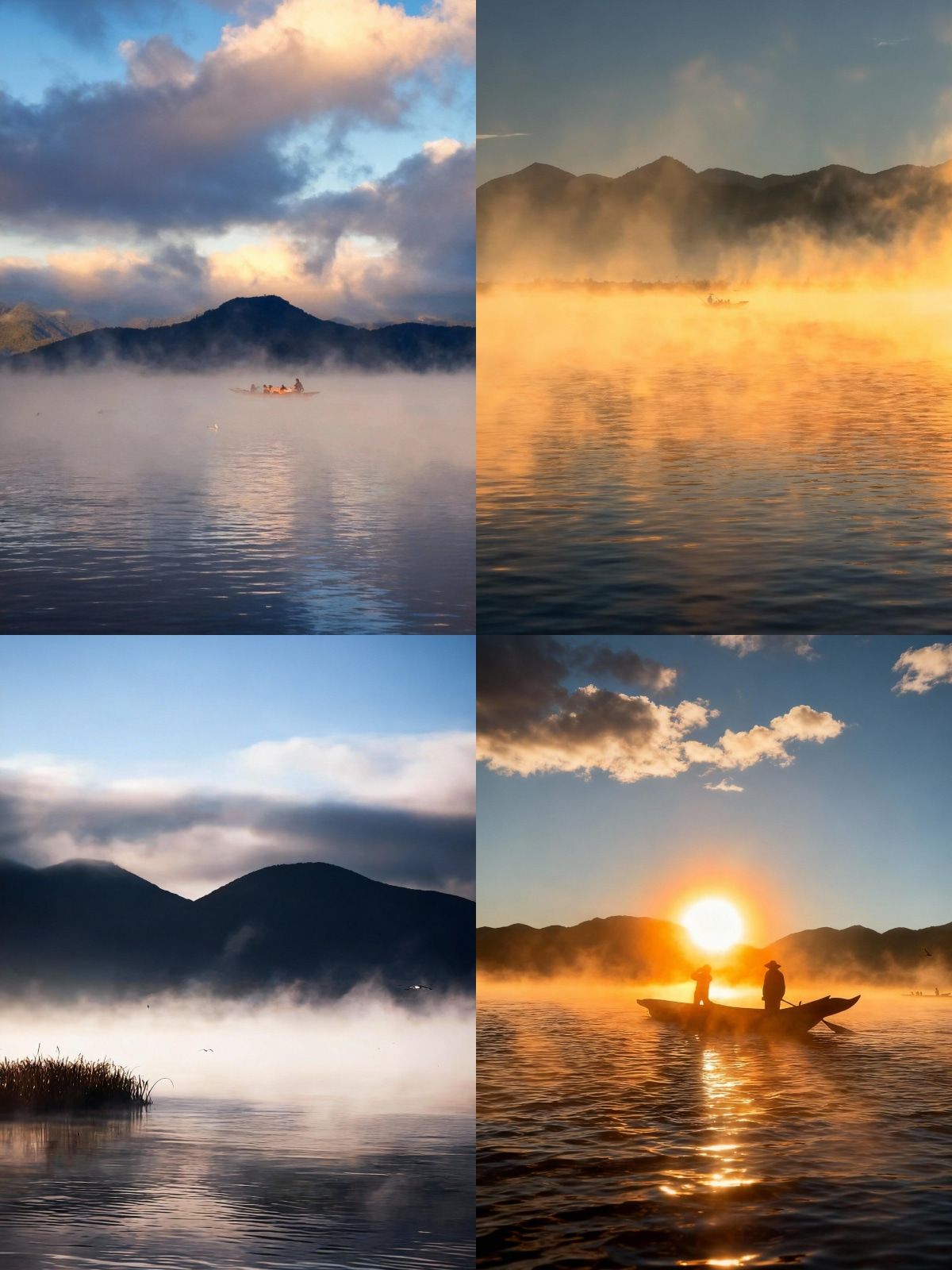 8:00 金光穿霧:太陽一出來絕了!霧氣從乳白變成香檳色,金斑撒在湖面上,紅嘴鷗追著船飛,伸手就有小家伙來啄魚干,高速連拍根本停不下來