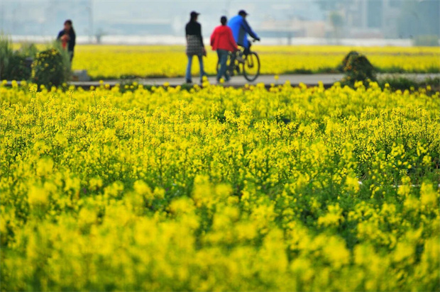的光芒與翠綠的莖葉交相輝映,成群結(jié)隊(duì)的蜜蜂、蝴蝶在花叢中嬉戲,三五成群的游客在花海中拍照打卡,共同繪就了