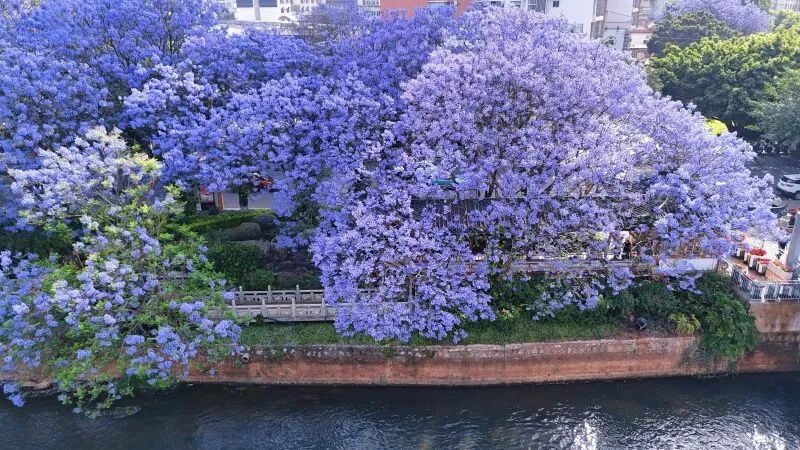 四月開始,開遠(yuǎn)的藍(lán)花楹率先登場。伸展的枝丫盛滿藍(lán)紫色的花朵,